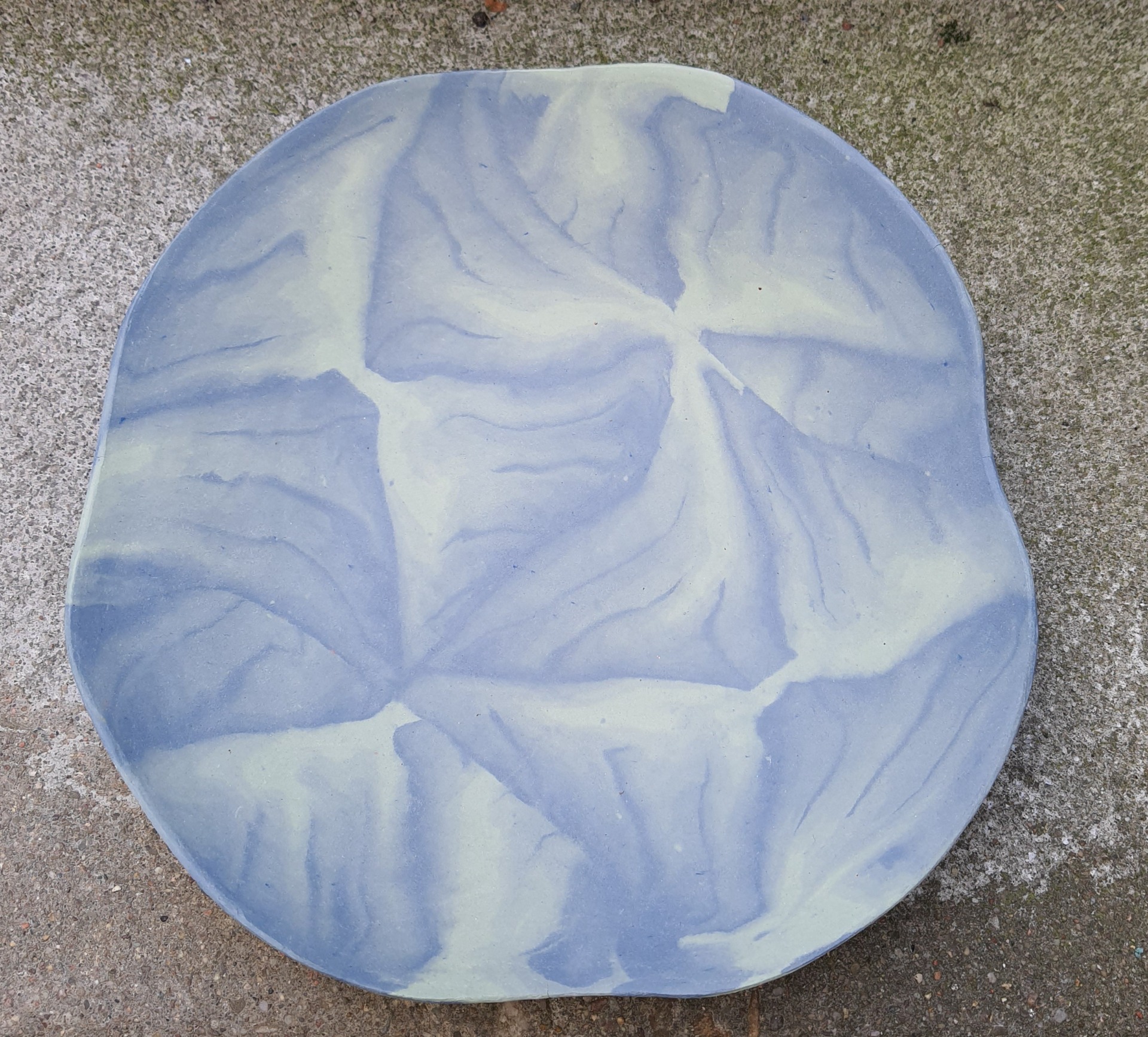 Mönstret finns i snittytan och syns först när man delar den på mitten. Ibland använder jag bara en bit, men ofta skär jag skivor och sätter ihop. Sedan kavlas leran ut och blir ett fat eller en vas. För att undvika sprickbildning förstärker jag med ofärgad lera som senare glaseras i en matchande färg. Men tyvärr händer det emellanåt att föremålen inte håller i bränningen.